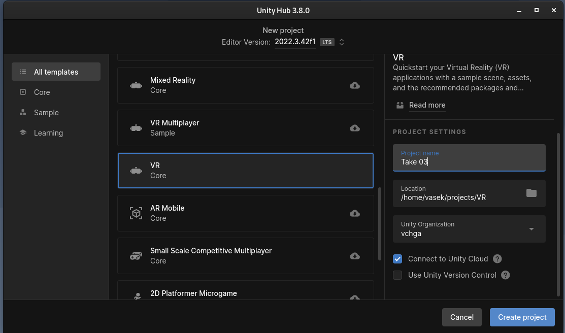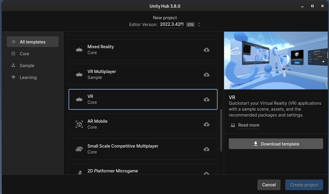 Zvol vestavěný template v Unity, který se jmenuje VR Core (před prvním spuštěním je třeba stáhnout).