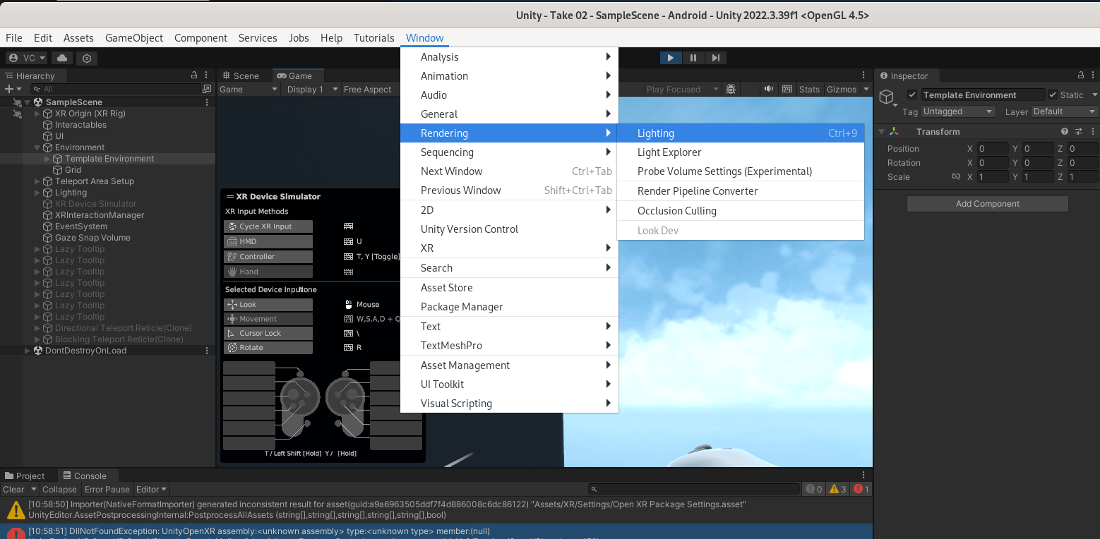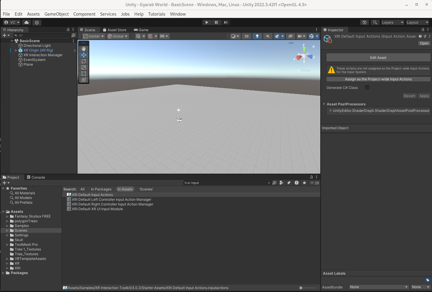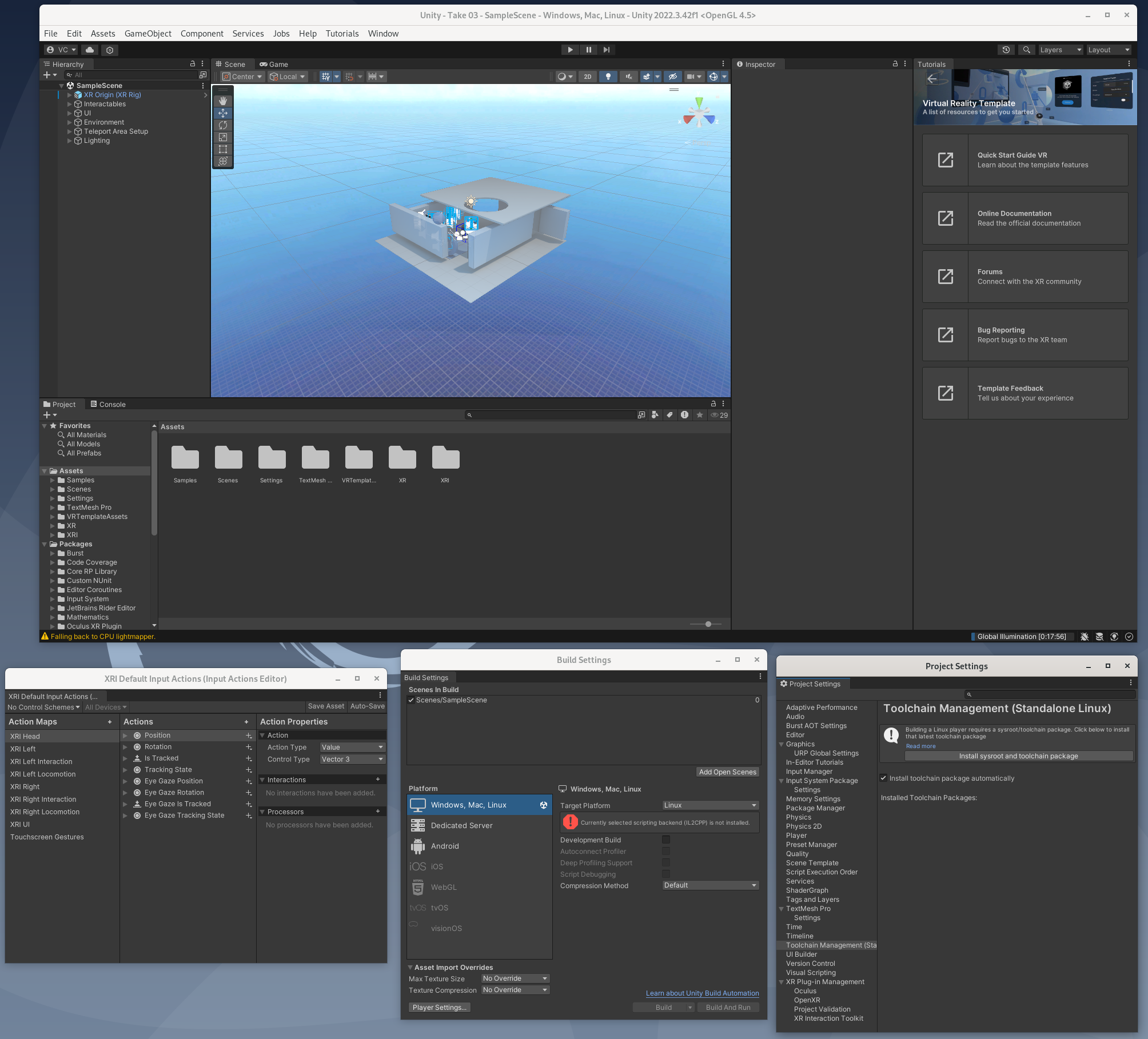 Nakonec se zobrazí hlavní okno Unity editoru a většinou se zobrazí i další okna s nastavením, ty se dají později vyvolat z havního menu File -> Build Settings a Edit -> Project Settings. Na obrázku je ještě vidět okno XR Default Input Actions Editor, ve kterém se dá měnit nastavení ovladačů, viz níže.
