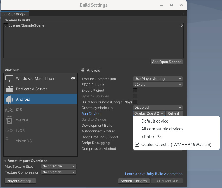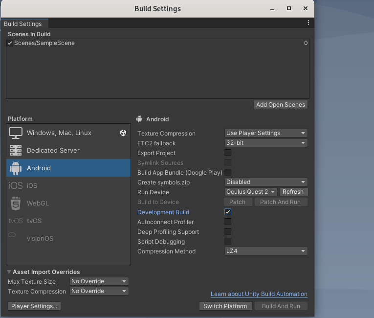 Nejprve je nutné v Build Settings změnit platformu z "Windows, Mac, Linux" na Android (potvrdit tlačítkem "Switch platform"). Poté je vhodné zapnout Development build a při běžné práci používat místo "Build and Run" tlačítko Patch and Run, nahrání do headsetu je pak rychlejší. Pozor, "Patch and Run" je možné používat až po prvním úspěšném proběhnutí Build and Run.