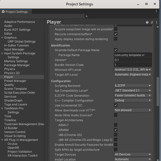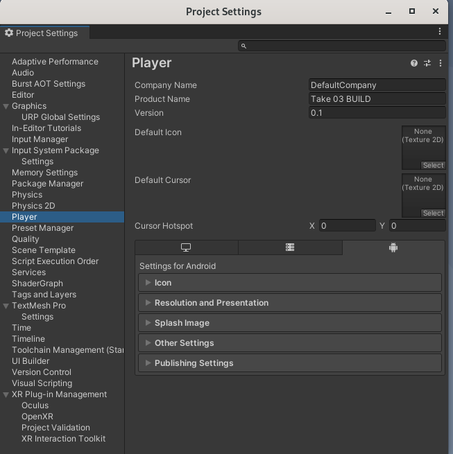 V okně Project Settings můžeme v záložce Player nastavit Product Name, což je název aplikace v headsetu - zde je třeba se vyvarovat kolizí z jinými projekty (např. od spolužáků). Lze také nastavit Company Name a Version.