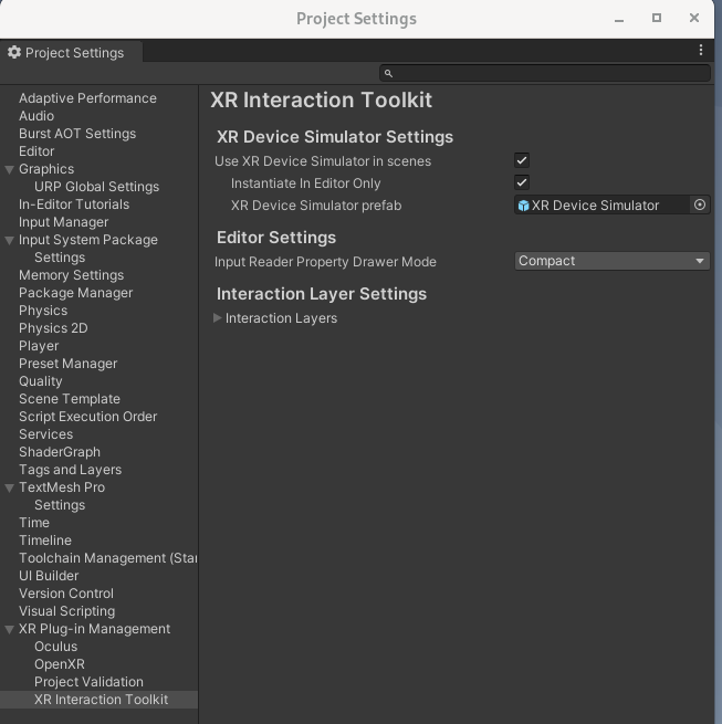 V podmenu nastavení XR Interaction Toolkit si můžeme zapnout simulované ovladače Oculus VR tak, abychom i bez headsetu mohli testovat ovládání naší aplikace přímo v simulátoru Unity.