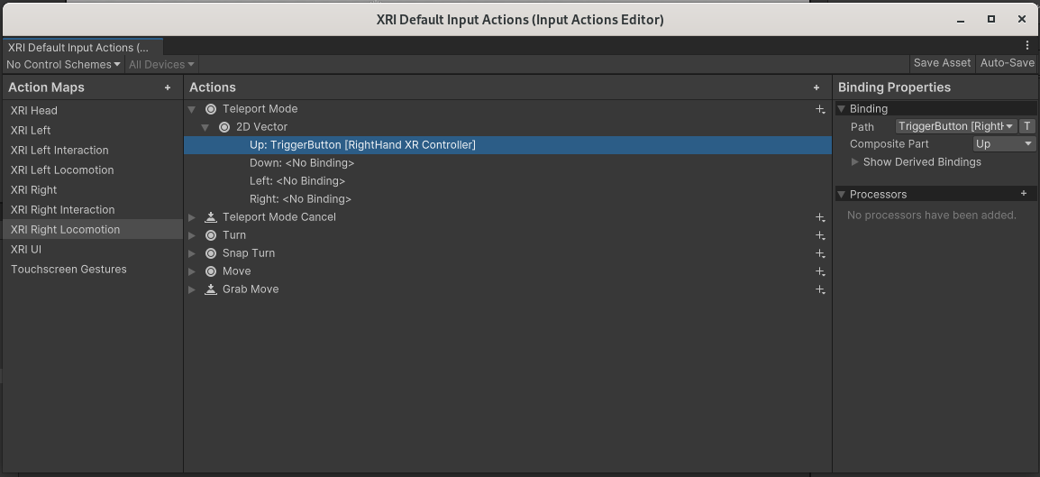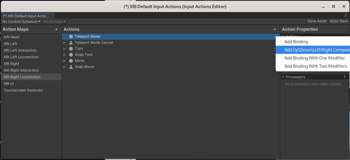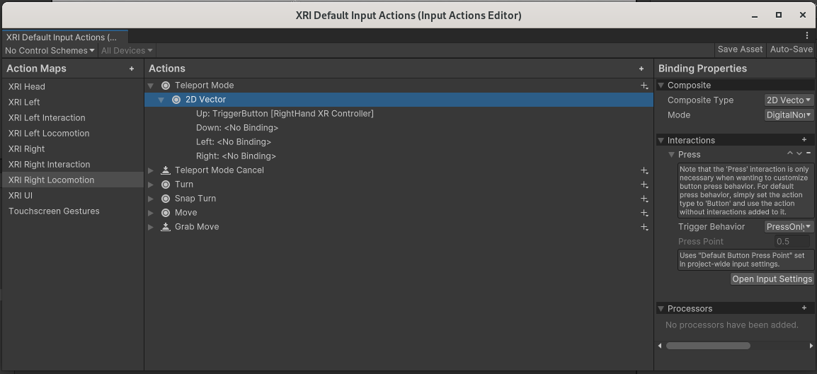 V levém menu nalezneš pravý ovladač pod XRI Righy Locomotion, tam pod Teleport Mode odstraň současný podzáznam Primary2DAxis a místo něj vlož nový Up\Down\Left\Right Composite.