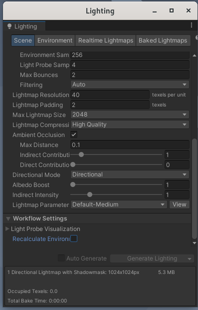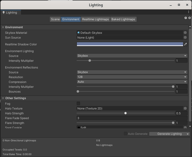 V záložce Environment je možné nastavit SkyBox Material - který určuje oblohu ve scéně.